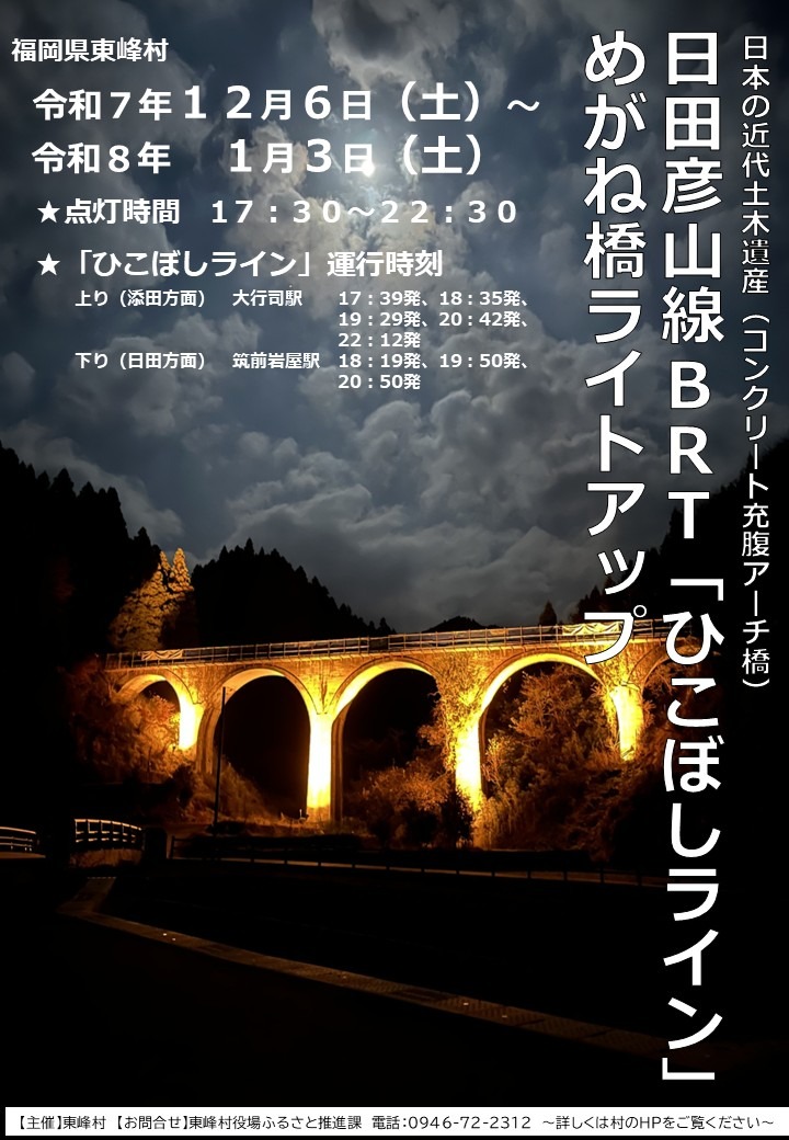 日本の近代土木遺産である日田彦山線の宝珠山橋梁と栗木野橋梁(通称「めがね橋」)をライトアップします。